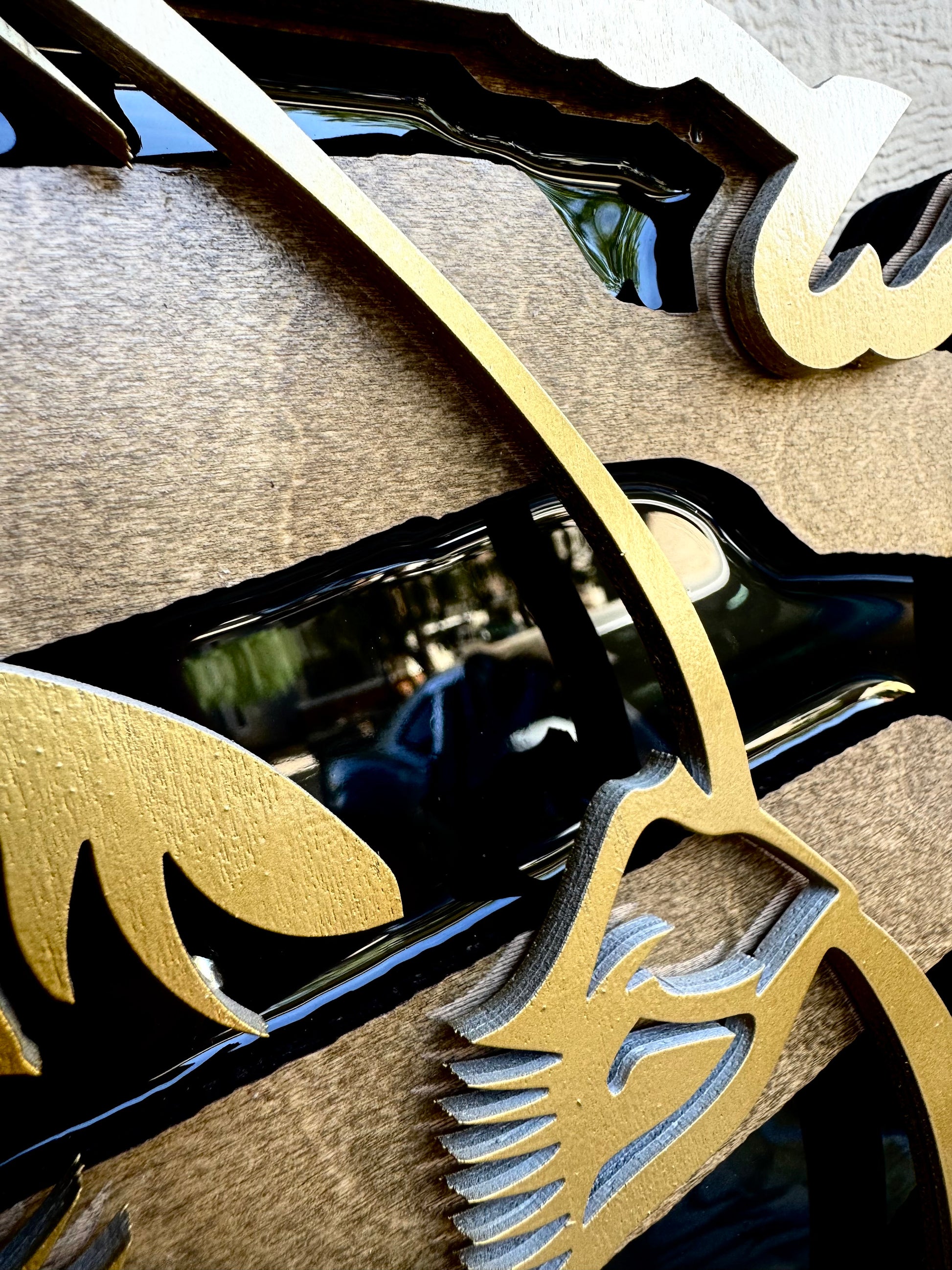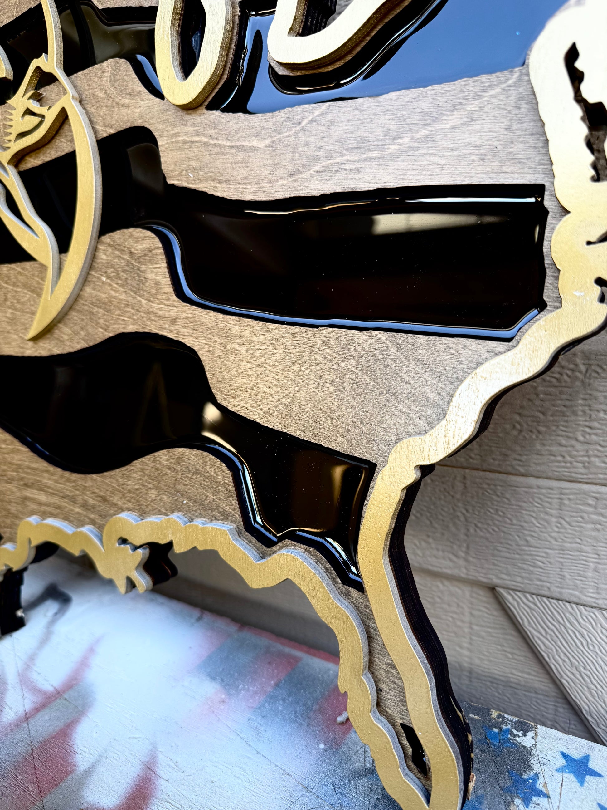 At the forefront, a beautifully detailed bald eagle—cut from wood and inlaid with durable, high-gloss epoxy resin—adds a powerful and symbolic touch. The layered design brings depth and texture, making this wall art a striking centerpiece in any room.