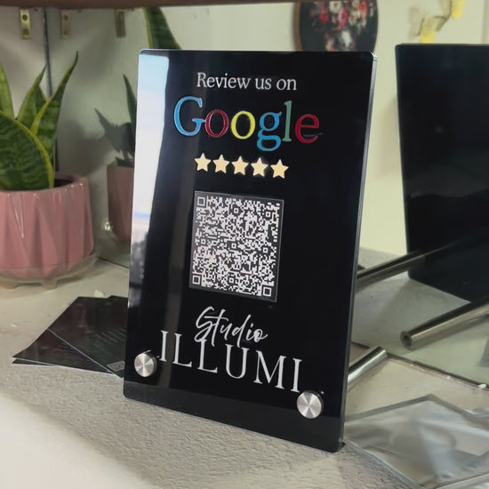 Showcase your top-rated feedback with a refined, dimensional display built to elevate your brand. Crafted from ⅜″ clear cast acrylic, this 8″ × 11″ sign features individually cut acrylic graphics (your logo, QR code, stars, etc.) that are meticulously glued onto the front panel for a high-end layered effect. The sign is mounted on brushed stainless steel legs for a clean, professional look.